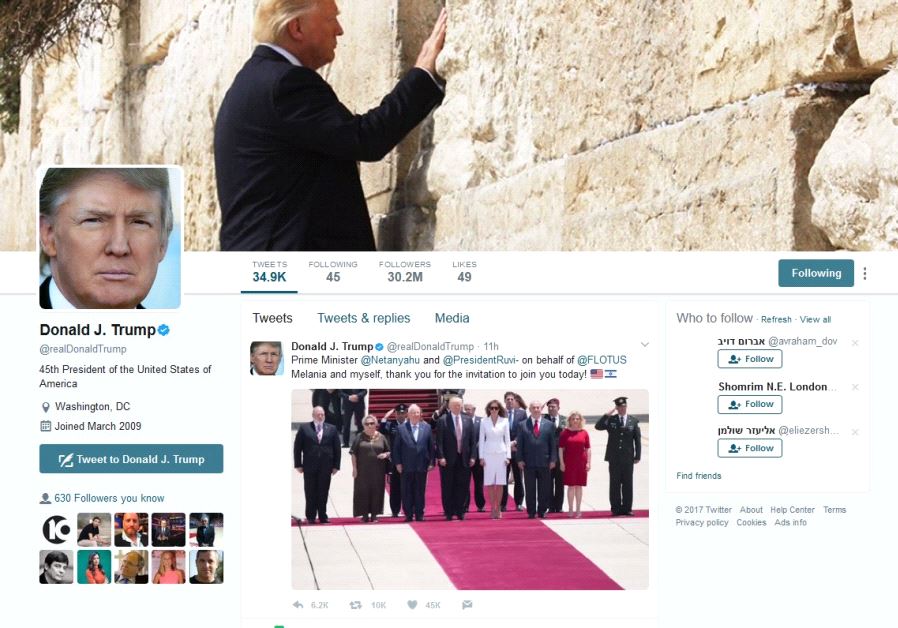 Israel on Trump's mind - and on his TwitterAfter visit to Western Wall, Trump changes Twitter bannerA still image of Donald Trump's Twitter account with a photograph of him at the Western Wall as the banner image(photo credit: screenshot)