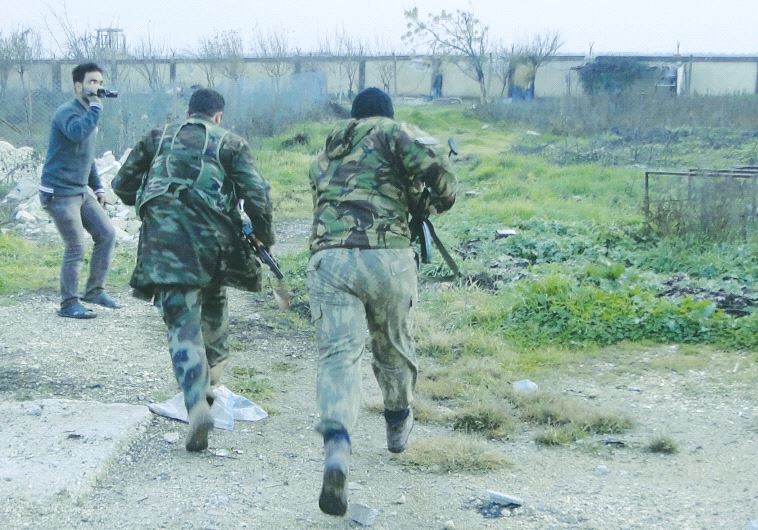 FREE SYRIAN ARMY fighters are filmed as they run toward a fence to avoid snipers loyal to Syrian President Bashar al-Assad in Aleppo’s countryside.(photo credit: REUTERS)ByNURLAN ALIYEV