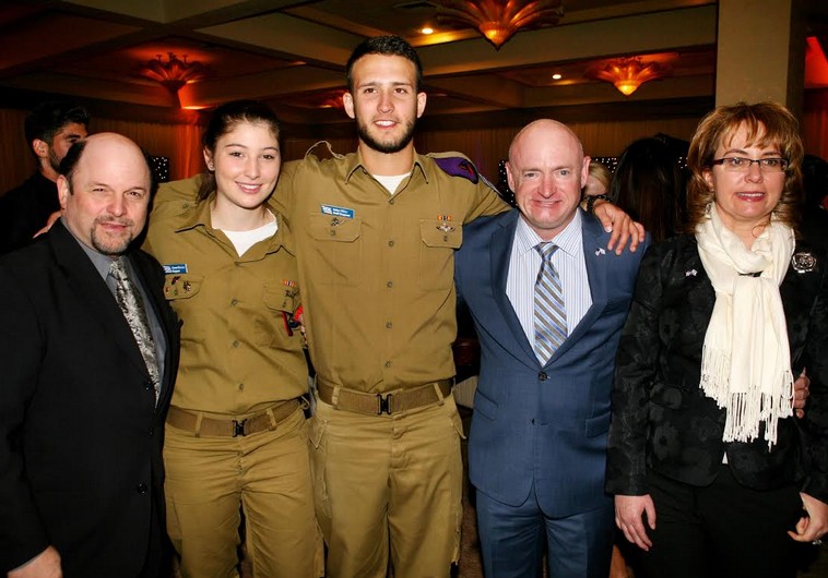 Actor Jason Alexander, Lone Soldiers Sgt. Emma and Staff-Sgt. Sahar, astronaut Mark Kelly and former Congresswoman Gabrielle Gifford(photo credit: NOAM CHEM)ByMARCY OSTER/JTA