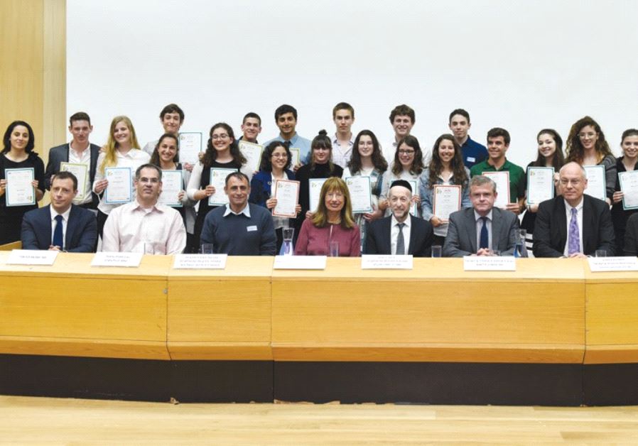 TOP WINNERS at this week’s Intel-Israel Young Scientist Competition stand behind the panel of judges as they display certificates representing scholarship awards.(photo credit: Courtesy)ByJUDY SIEGEL-ITZKOVICH