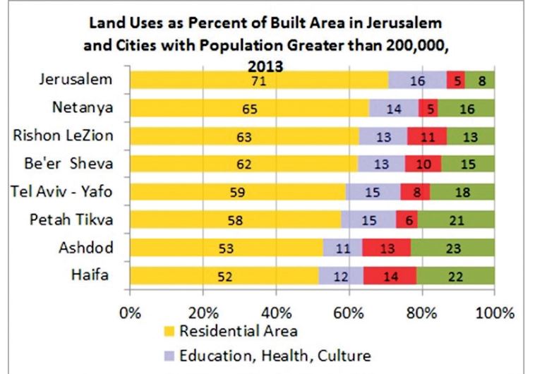 Among the major cities with a population greater than 200,000, Jerusalem dedicates the highest percentage of its built-up areas to residential purposes (71% ).