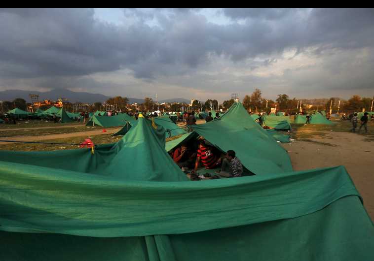 People sit inside their makeshift shelter on open ground after an earthquake in Kathmandu, Nepal April 26