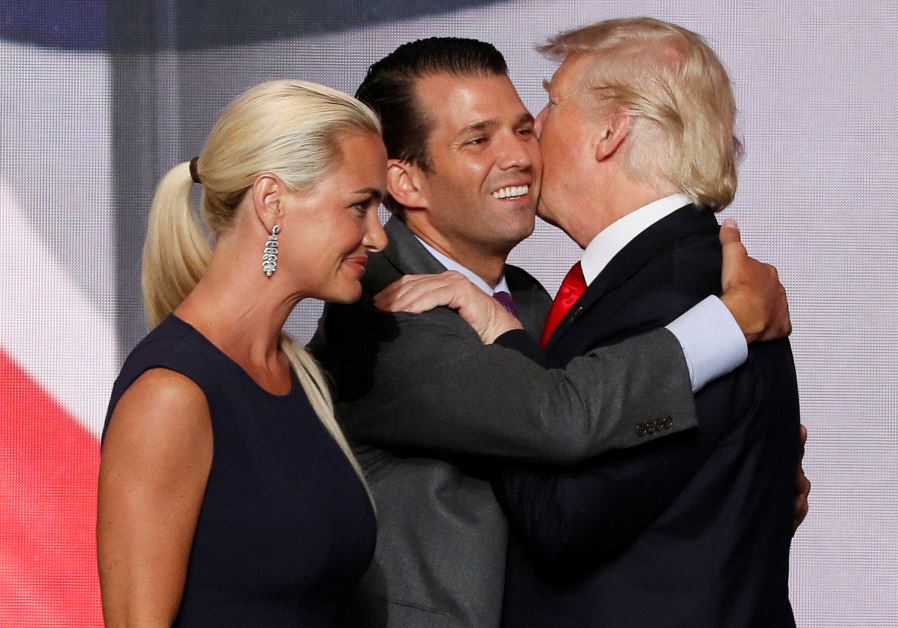 Donald Trump Jr. (C) hugs his father, Donald Trump as Donald Jr's wife Vanessa (L) walks past after Trump accepted the Republican presidential nomination at the 2016 Republican National Convention in Cleveland, Ohio U.S. July 21, 2016.(photo credit: REUTERS/MIKE SEGAR)ByREUTERS