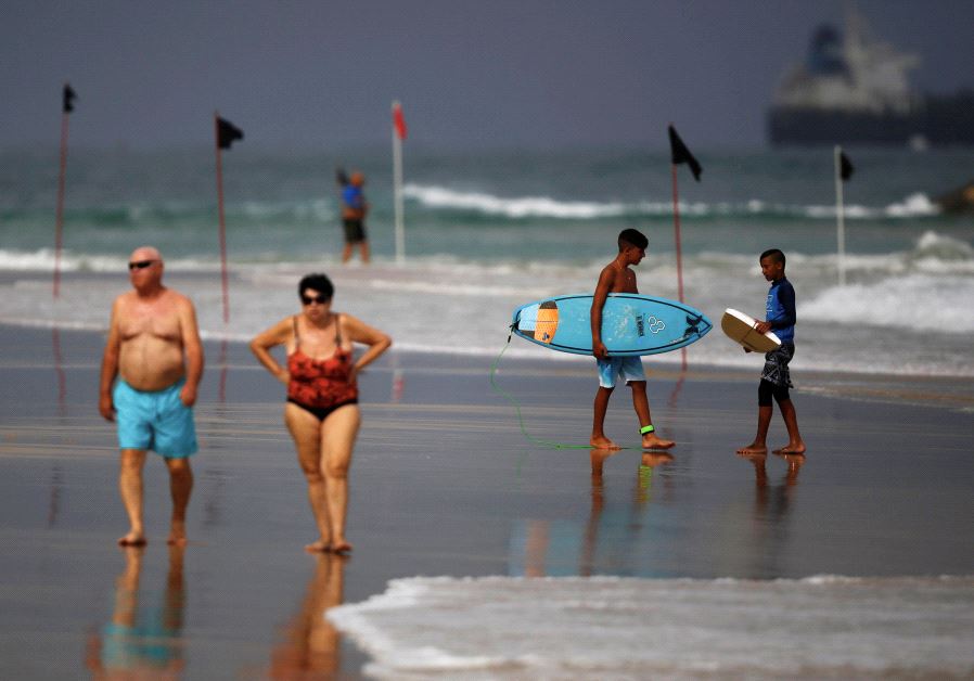 Youth holding surf boards chat as a couple walks along the shore of the Mediterranean Sea at a beach in Ashkelon, Israel June 21, 2017. (photo credit: REUTERS/AMIR COHEN)ByJUDY SIEGEL-ITZKOVICH