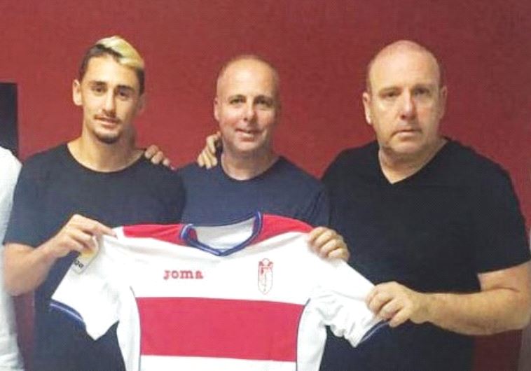 Omer Atzili (left) poses yesterday with a shirt of La Liga club Granada CF with his agents Ronen and Gilad Katzav after completing his move to the Spanish club.(photo credit: GRANADA WEBSITE)ByALLON SINAI
