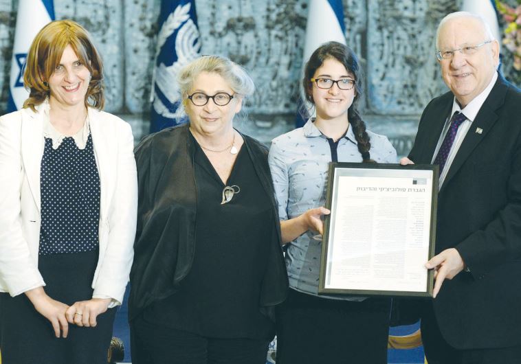 PRESIDENT REUVEN RIVLIN and his wife, Nechama, present a certificate of recognition yesterday to Yisca Shaki, who won first prize in a writing competition for a story she wrote inspired by Shai Agnon, as Shaki’s mother looks on(photo credit: MARK NEYMAN / GPO)ByGREER FAY CASHMANUpdated: