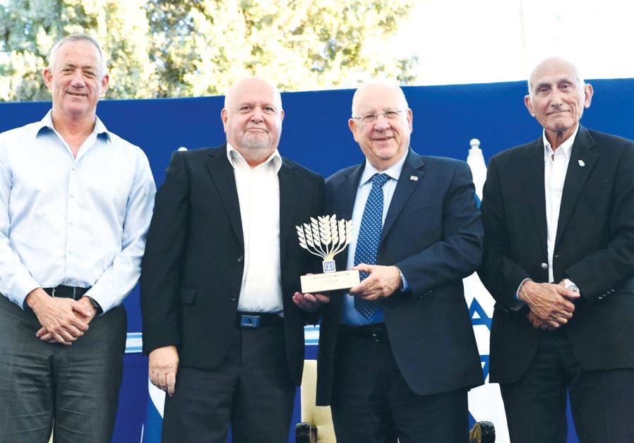 PRESIDENT REUVEN RIVLIN attends the President’s Prize for Volunteerism event at his official residence in Jerusalem on Wednesday along with former IDF chief of staff Lt.- Gen. (res.) Benny Gantz (left) head of the prize committee; honoree Itzik Zivan (second right), from Caesarea, who has been volun(photo credit: MARK NEYMAN / GPO)ByGREER FAY CASHMAN