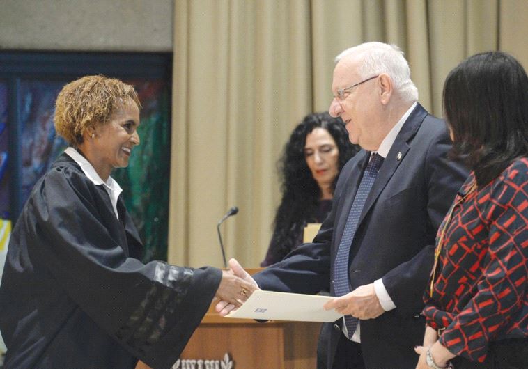 NEWLY APPOINTED Judge Ednaki Sebhat Haimowitz shakes hand with President Reuven Rivlin yesterday at the President’s Residence in Jerusalem.(photo credit: MARK NEYMAN/GPO)ByGREER FAY CASHMAN
