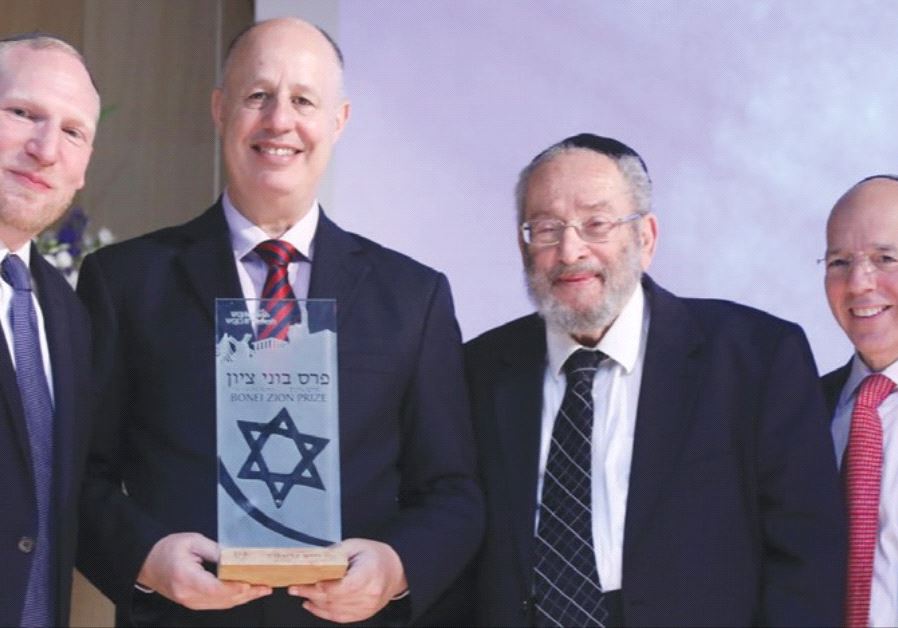 RABBI CHAIM BROVENDER (second right) looks to receive his award, accompanied by Regional Cooperation Minister Tzachi Hanegbi (center) and Nefesh B’Nefesh cofounders Rabbi Yehoshua Fass (left) and Tony Gelbart.(photo credit: KNESSET)ByJAMIE HALPER