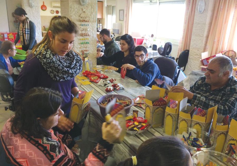 Residents and volunteers prepare some of the 1,500 Purim gifts for Migdal Ha’emek’s schoolchildren at the Grabski Center in the North yesterday(photo credit: Courtesy)ByLIDAR GRAVÉ-LAZIUpdated: