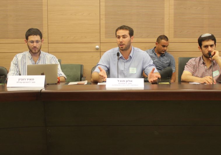 CEO and founder of 'Tacharut', Alon Tuval (center), speaks at the Freedom of Employment Conference at the Knesset. (photo credit: UDI SHAHAM)ByUDI SHAHAMUpdated: