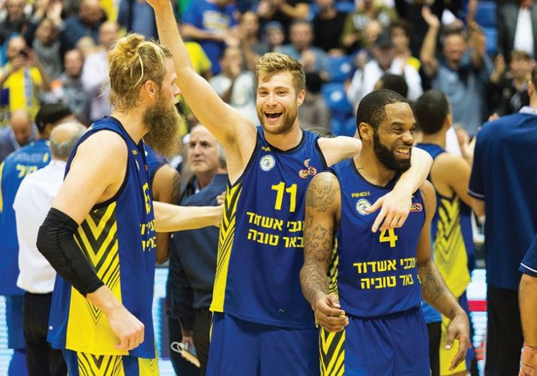 Maccabi Ashdod’s Jonathan Skjoldebrand (left), Willy Workman (center) and Isaiah Swann celebrate after their team’s 84-82 double-overtime win over Maccabi Rishon Lezion in the State Cup semifinals at Yad Eliyahu Arena last night.(photo credit: ODED KARNI/ISRAEL BASKETBALL ASSOCIATION))ByALLON SINAIUpdated: