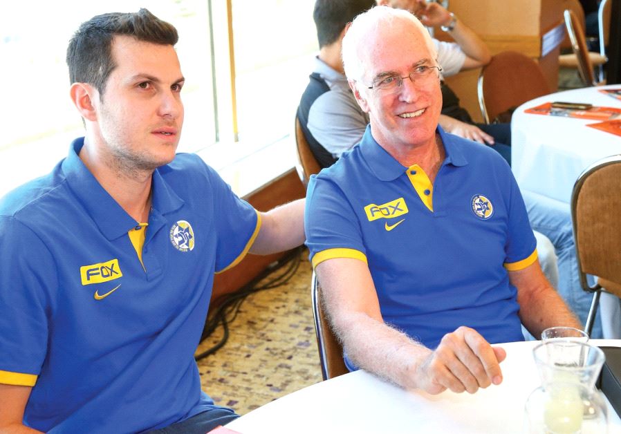 Maccabi Tel Aviv’s new coach Arik Shivek (right) sits alongside captain Guy Pnini.(photo credit: DANNY MARON)