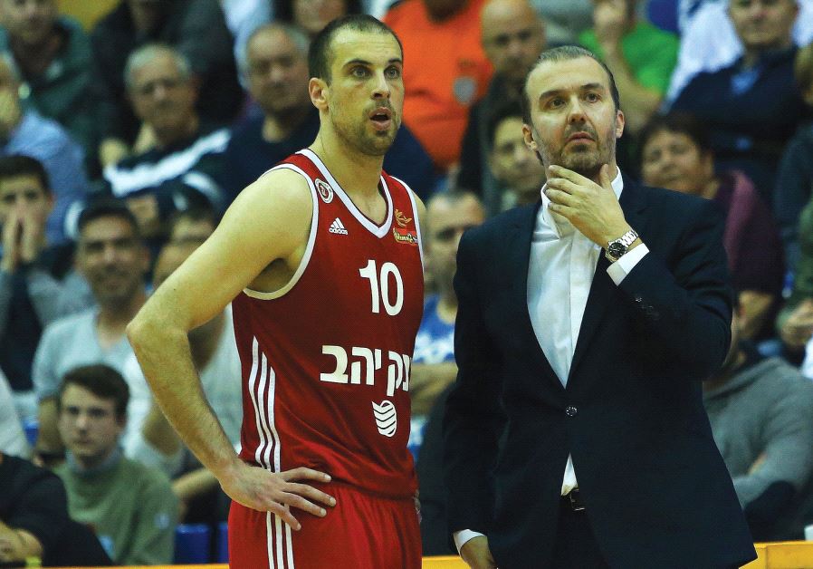 Hapoel Jerusalem coach Simone Pianigiani (right) and captain Yotam Halperin called on the team’s fans to pack the Jerusalem Arena tonight in Game 1 of the Eurocup quarterfinal series against Spain’s Gran Canaria. (photo credit: UDI ZITIAT)ByALLON SINAI
