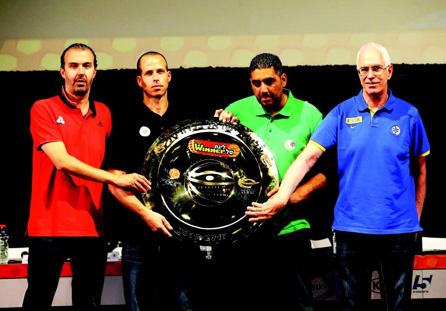 Coaches from 4 BSL Final Four teams (from left) Hapoel Jerusalem (Simone Pianigiani), Maccabi Rishon Lezion (Shmulik Brenner), Maccabi Haifa (Ofer Rahimi) and Maccabi Tel Aviv (Arik Shivek)(photo credit: UDI ZITIAT)