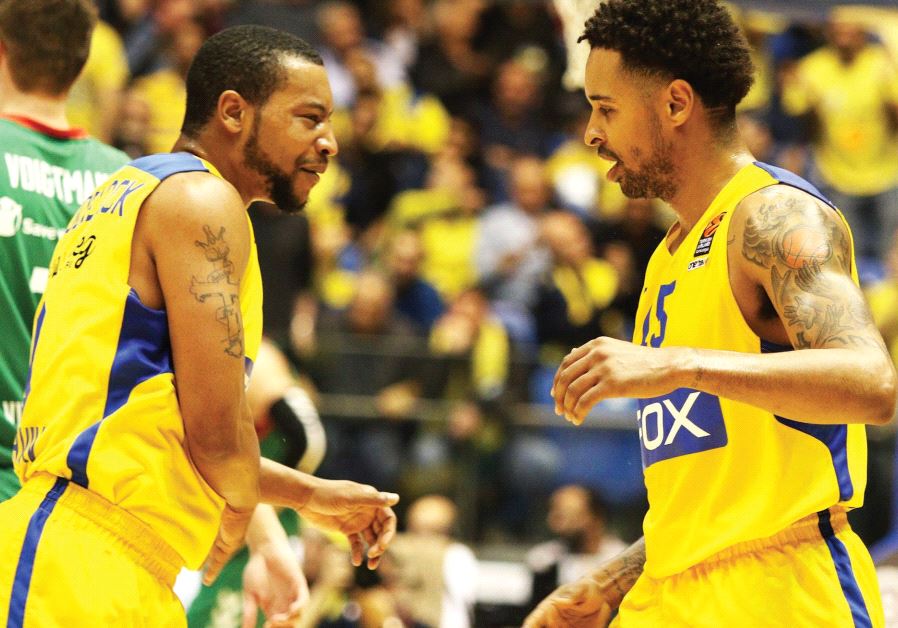 Maccabi Tel Aviv’s top scorers Andrew Goudelock (left) and Sylven Landesberg celebrate during last night’s 85-84 win over Baskonia Vitoria at Yad Eliyahu Arena.(photo credit: ADI AVISHAI)ByALLON SINAI