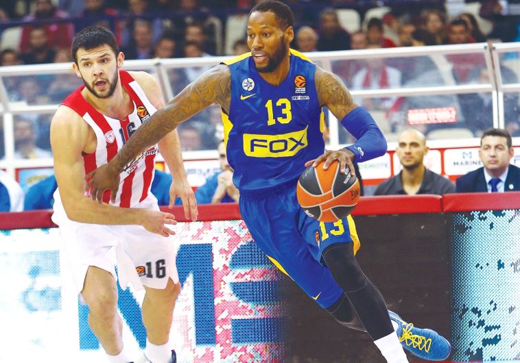 Maccabi Tel Aviv forward Sonny Weems (right) contributed 12 points, six assists and five rebounds, as well as excellent defense on Vassilis Spanoulis, in last night’s 80-73 win against Olympiacos and Kostas Papanikolaou (6) in Athens.(photo credit: UDI ZITIAT)ByALLON SINAI