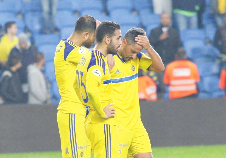 Maccabi Tel Aviv players Barak Itzhaki (right), Eyal Golasa (center) and Eden Ben-Basat (left) couldn’t hide their frustration at the end of last night’s 0-0 draw against Hapoel Ashkelon in Premier League action(photo credit: ADI AVISHAI)ByALLON SINAI