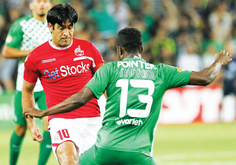 Hapoel Beersheba striker Elyaniv Barda (in red) and Maccabi Haifa defender Taleb Tawatha (13) are set to clash once more when their teams meet tonight in the State Cup semifinals at Haifa Stadium.(photo credit: DANNY MARON)ByALLON SINAI