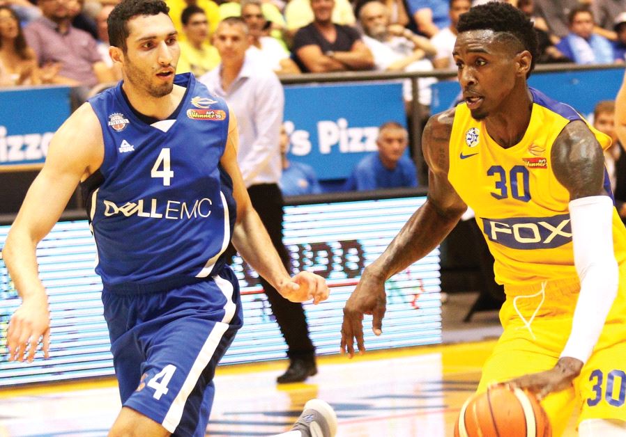Maccabi Tel Aviv forward Quincy Miller (right) scored a game-high 19 points in last night’s series-clinching 105-68 home win over Karam Mashour (left) and Bnei Herzliya.(photo credit: ADI AVISHAI)ByALLON SINAI