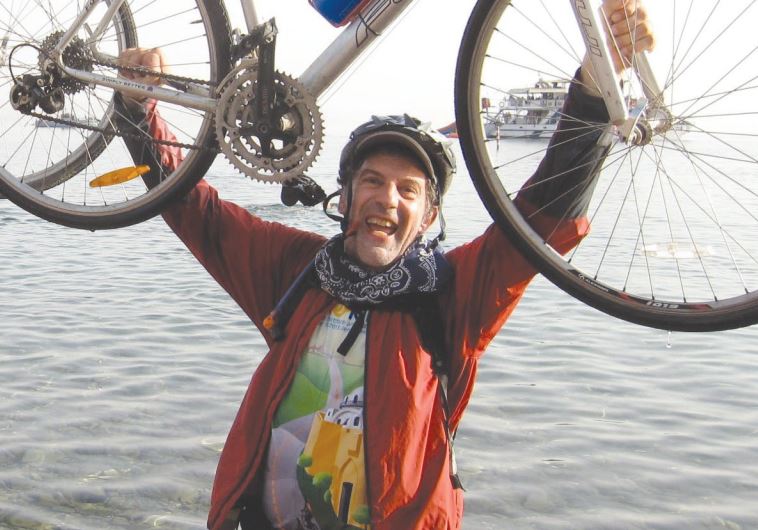 FRANKLYN D. MEDJUCK holds up his bicycle in Eilat at the end of the Hazon Bike Ride marathon he did in Israel three years ago.(photo credit: Courtesy)ByANDREW SILOW-CARROLL / JTA