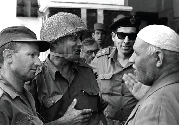 Former defense minister Moshe Dayan, (center), and Gen. Rehavam Ze'evi, (2nd left), in conversation with the Palestinian keeper of the Cave of the Patriarchs in Hebron during the Six Day War(photo credit: AFP PHOTO)ByYOSSI MELMANRead More