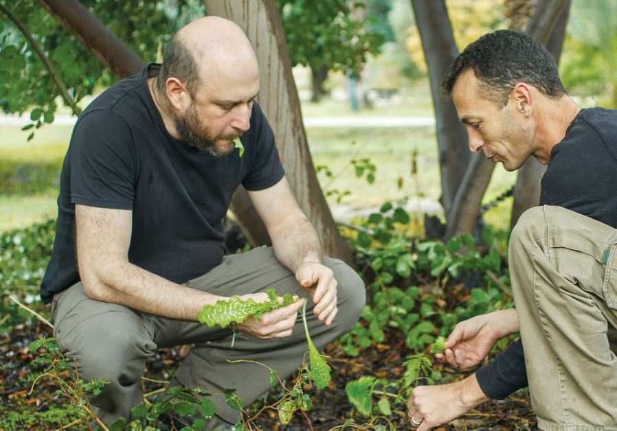 From left: Uri Mayer Chissick and Yizhar Sahar harvest produce from the fertile grounds of the Rutenberg Restaurant in the northern Jordan Valley