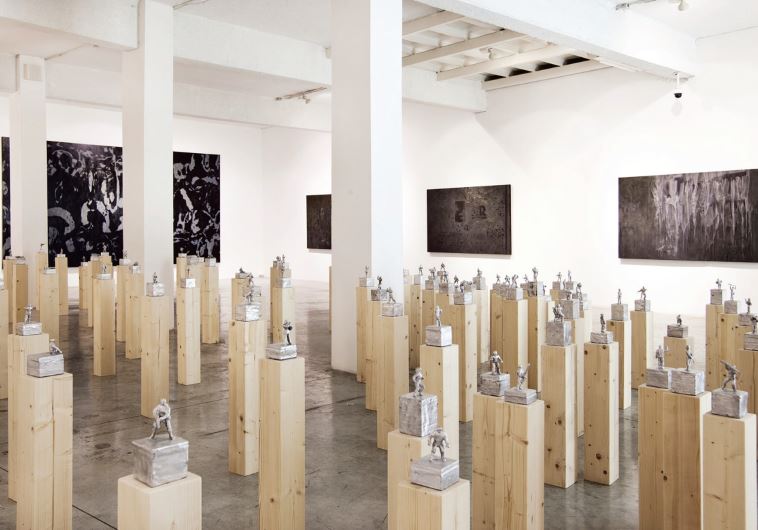 In the crosshairsDissecting Israel’s collective emotional baggage as a country perpetually on the brink of war.Figures of soldiers surrounded by stark monochrome paintings(photo credit: RON ERDE)