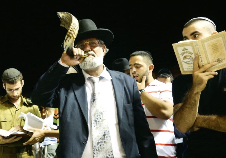 A man blows a shofar while others read ‘slihot’ during the Days of Awe at the Western Wall(photo credit: MARC ISRAEL SELLEM)
