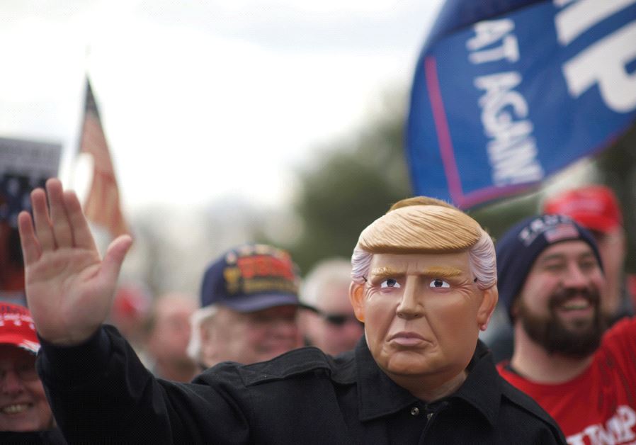 A familiar Purim taleNever before has an Orthodox Jew been so close to the seat of power through family connections.A marcher in a Trump mask. (photo credit: REUTERS)