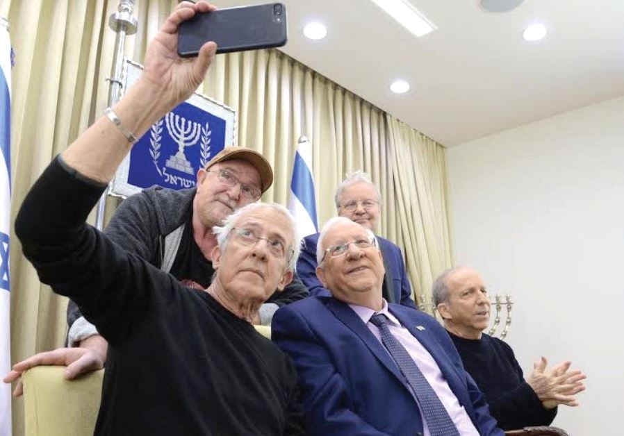 GIDI GOV takes a selfie with President Reuven Rivlin, Danny Sanderson (right), Ephraim Shamir (standing, left) and Alon Oleartchik.(photo credit: MARK NEYMAN/GPO)ByGREER FAY CASHMAN
