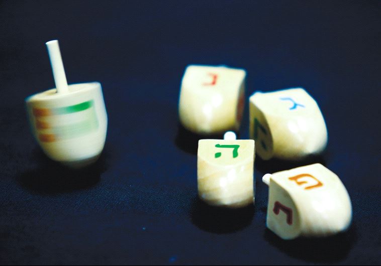 HANUKKA DREIDELS display the letters of the Hebrew acronym for ‘A great miracle happened here.’(photo credit: MARC ISRAEL SELLEM/THE JERUSALEM POST)ByLIAT COLLINS