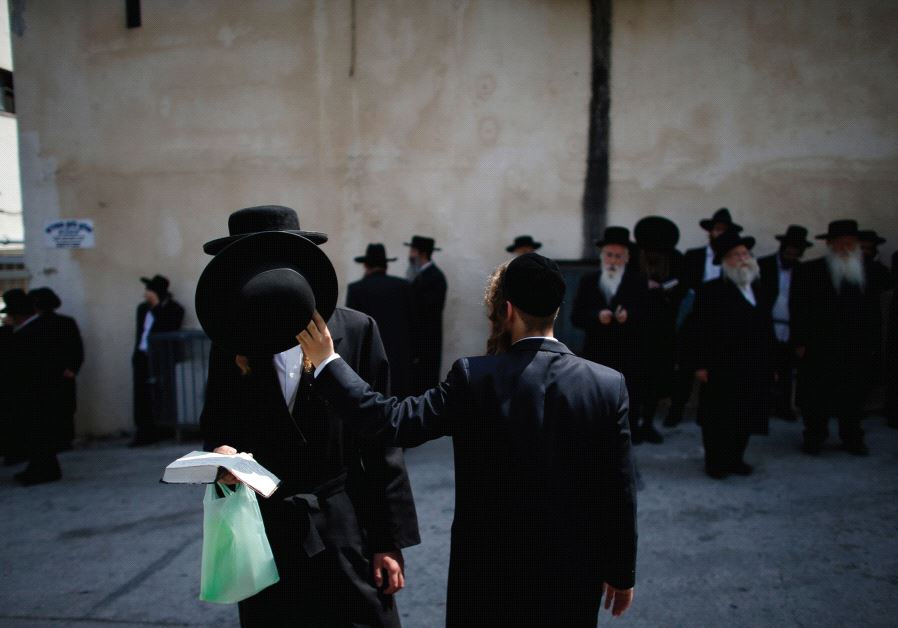 ULTRA-ORTHODOX MEN participate in a 2014 protest outside an IDF recruiting office in Jerusalem
