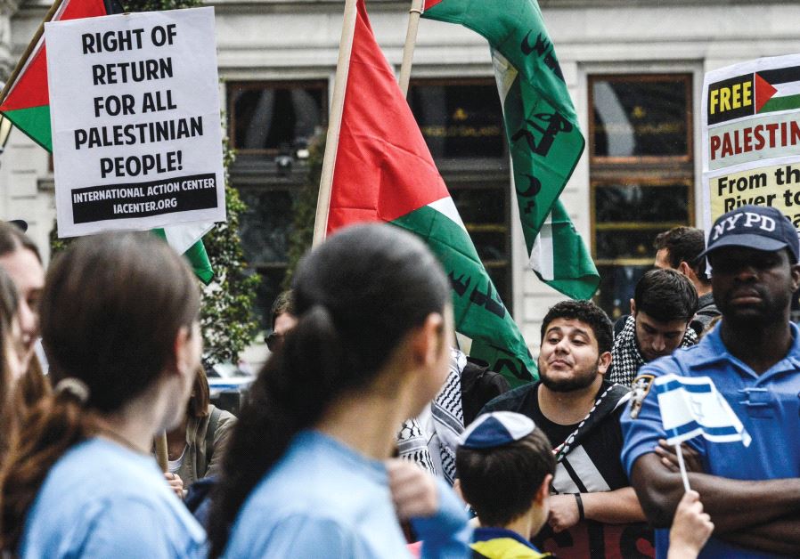 PEOPLE HOLDING Palestinian-rights placards taunt marchers in the Celebrate Israel Parade along New York’s Fifth Avenue earlier this month.(photo credit: STEPHANIE KEITH/REUTERS)ByLINDSAY GABOW